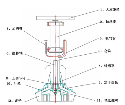 該多槽浮選機由電動機三角代傳動帶動葉輪旋轉,產生離心作用形成負壓,一方面吸入充足的空氣與礦漿混合,一方面攪拌礦漿與藥物混合,同時細化泡沫,使礦物粘合泡沫之上,浮到礦漿面再形成礦化泡沫。 調節閘板高度,控制液面,使有用泡沫被刮板刮出。